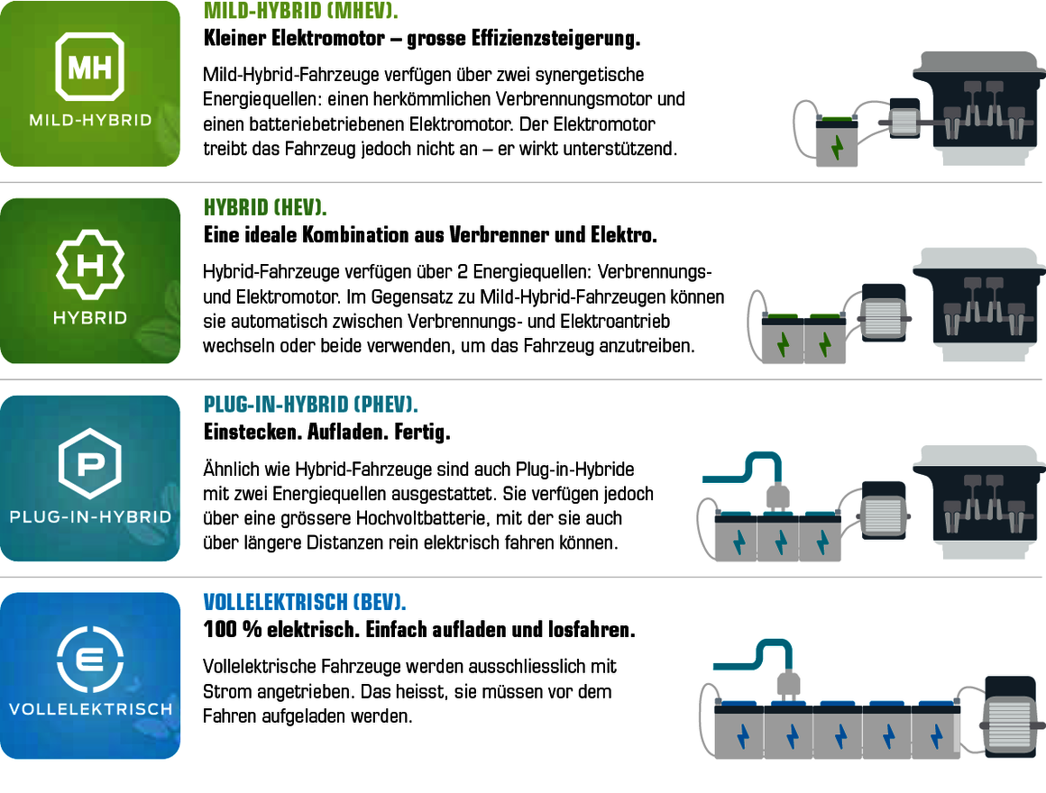 Wenn Ihr Fahrzeug über einen Hybrid- oder reinen Elektroantrieb verfügt, kann es im Vergleich zu einem traditionellen Verbrennungsmotor geringere Emissionen ausstossen. Während des Fahrbetriebs produziert ein reines Elektrofahrzeug gar keine Emissionen.